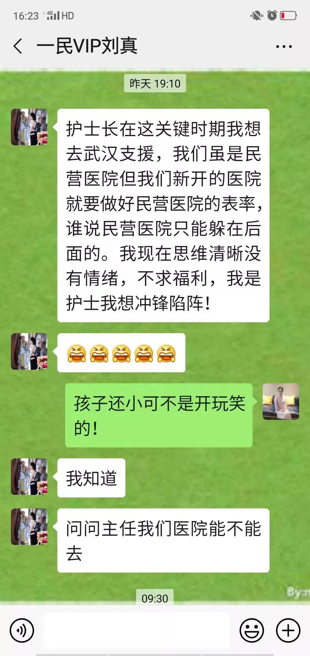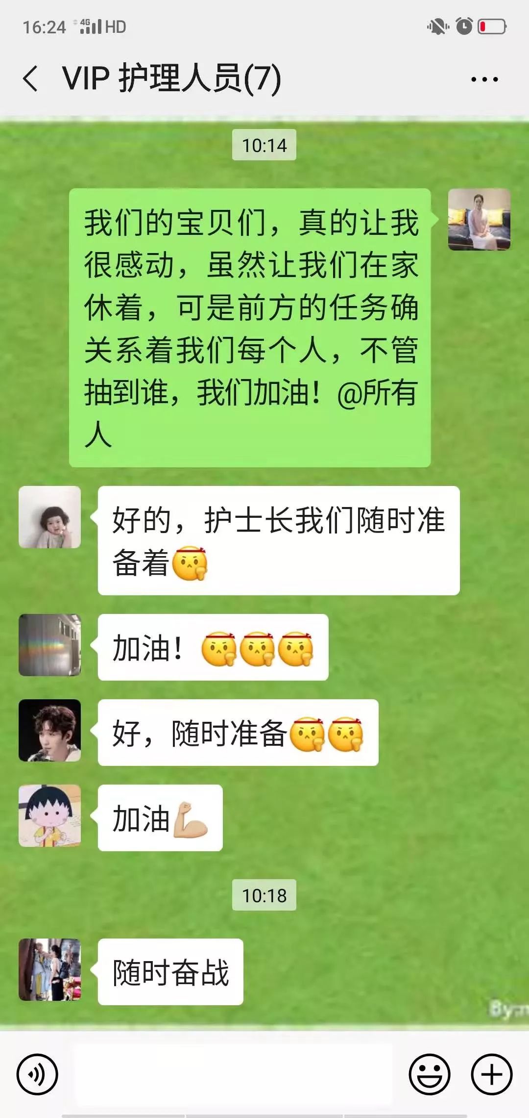 “护士长我年龄最大,我要做表率作用,作为中国人民解放军某三甲医院出来的的一名老护士,不让我上还让小的上吗!”这是我科的刘真,家里有两个孩子,一个4岁,一个3岁,她一遍又一遍的给我发消息请战,护士长我要请战去武汉,我要去我们的发热病房,说实话从心里我是一百个不同意,孩子那么小,正是晚上找妈妈的时候,如果去了,不能和家人见面,再说也怕传染孩子啊!