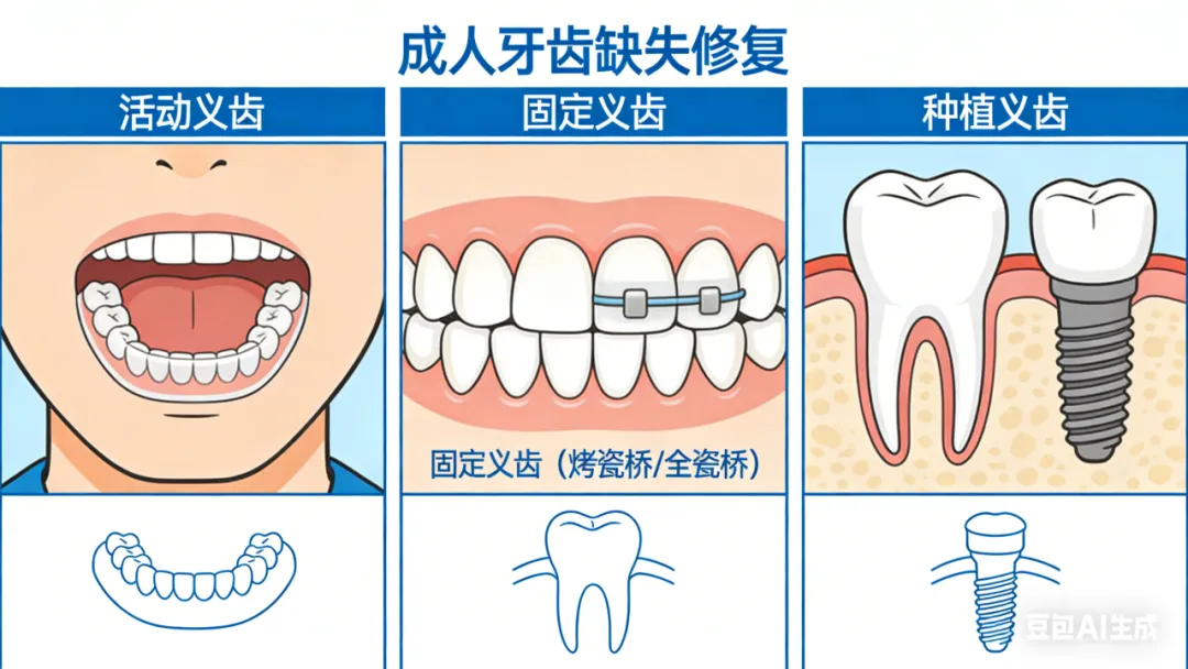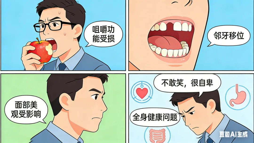 成年后,牙齿是不可再生的。无论什么原因导致的缺失,如果不及时修复,都会引发一连串的连锁反应。