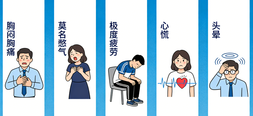 1胸闷胸痛:胸口像被压了块大石头,反复发作,或疼痛放射到肩膀、后背甚至牙床。