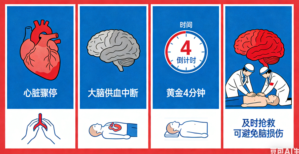 心脏骤停后,大脑供血中断。黄金4分钟至关重要:4分钟内进行有效心肺复苏并使用AED除颤,存活率可达90%;每延误1分钟,存活率下降10%。第一目击者就是患者最大的希望,请不要犹豫。